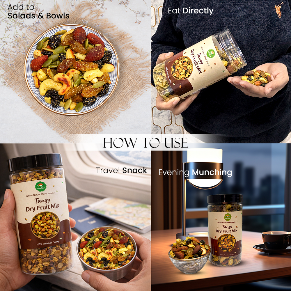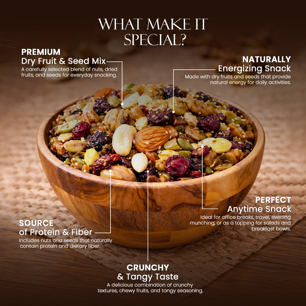 Our Tangy Masala Dry Fruit Mix is a thoughtfully crafted blend of premium dry fruits and seeds,